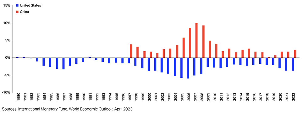 Post COVID-19 it has recovered to over 2% but this figure is indicative of the Chinese economy trying to move away from an export (X) driven economy and rely more on domestic consumption(C). This move is helpful in that big surpluses and deficits can impact global financial stability especially when they beyond 3% of GDP. The US economy has not posted a current account surplus since 1990 which means it has to borrow from abroad and therefore about 25% of its foreign debt is held by foreigners. Japan and China own more than 25% of foreign US treasury securities. You could say that Japan and China lent the US the money to buy their goods. Between 2002-2012 China’s holding of US debt rose from US$100 billion to US$1.3 trillion. Since 2018 it has declined by 30% to US$867 billion. This has helped the 2022 global debt-to-GDP ratio fall by $4 trillion to slightly below $300 trillion although it is still above pre-pandemic levels.