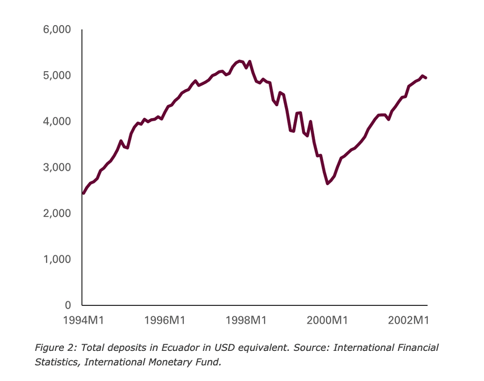 In 1999 Ecuador made the decision to dollarise its economy which basically curbed hyperinflation and helped prevent the sudden slide of the currency (sucre). With dollarisation people bring their dollars into the economy from overseas as was the case in Ecuador. Figure 2 shows how deposits in pesos in Ecuador fell by 50% when measured in dollars from February 1998 to December 1999 and then bounced back exactly when the economy was dollarised, recovering the February 1998 level by June 2002.