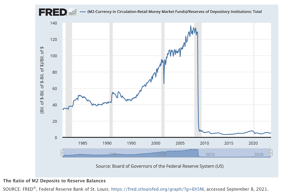 2007-09 – GFC. Ratio dropped to near zero and reflected as the US Fed injected cash into the banking system to help keep the banking system stable. Moreover, the level of reserves can change significantly as the US Fed try to maintain its dual mandate of stable prices and employment