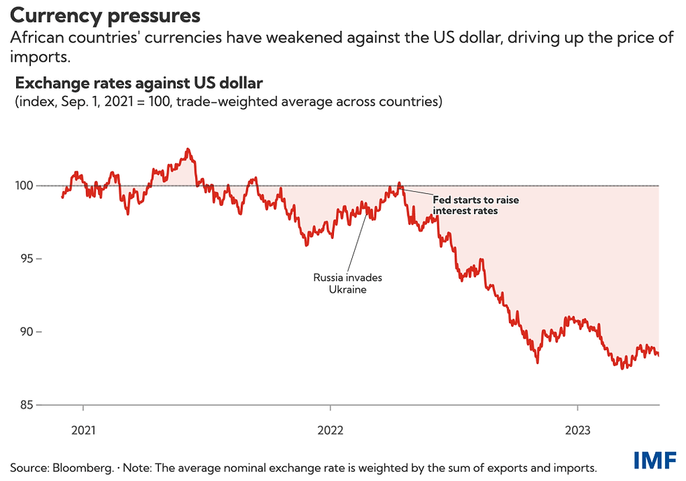 Contractionary monetary policy by the US Federal Reserve to keep inflation in-check has impacted African currencies. With higher interest rates in the US and a volatile global environment investors tend to run to the safety of the US dollar and higher paying US treasury bonds. This has led to a depreciation in African currencies and inflation as import prices increase. For most African countries more that 60% of imports are priced in US dollars and a 1% depreciation against the US dollar = an average of 0.22% increase in inflation.