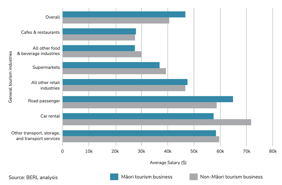 3,595 Māori tourism businesses operating in core and general tourism – (756 self-employed). The businesses employed 15,000 people – on average employ more staff and offer higher salaries than non-Māori businesses. See graphic.