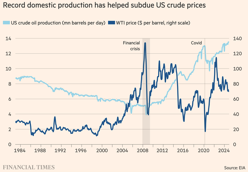 Reducing bureaucratic hurdles: There is limited research demonstrating that deregulation significantly affects inflation. While issuing more drilling permits could boost domestic oil and gas supply, the industry may hesitate to increase production beyond global market absorption capacity, potentially causing price declines – see graph from FT.